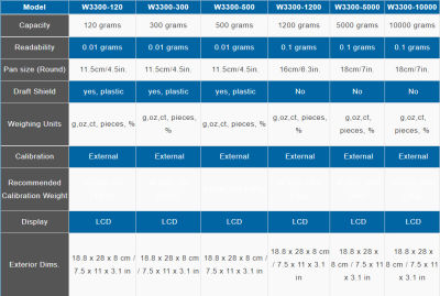 The Compact line includes 6 models covering a wide range of maximum weight capacities. The lower capacity units (120g, 300g, and 500g) are readable to 0.01 g, and come with a draft shield ring to prevent air currents from affecting measurements. These models feature a 4.5 inch diameter, stainless steel weigh pan. The larger capacity models (1000g, 5000g, and 10,000g) do not include the draft shield ring, come with larger weighing pans of 6.3 to 7 inch diameter, and are readable to 0.1g.