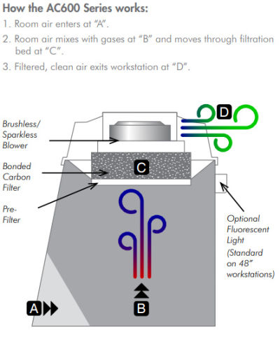 Filter and electronics are located above the workspace, eliminating the chance of a chemical spill entering these sensitive areas