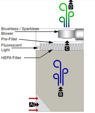 Filter and electronics are located above the workspace, eliminating the chance of a chemical spill entering these sensitive areas