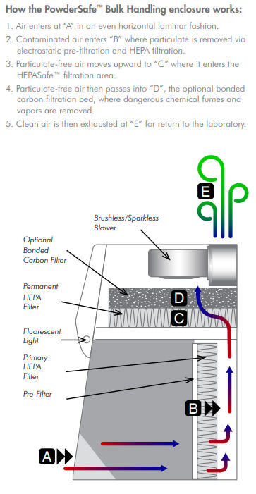 60" wide PowderSafe bulk handling enclosure with AirSafe automatic safety controller. Enclosure is standard with fluorescent light, dark blue base, two slip hatch ports, one waste port, drum access port with cover, and white support stand. Price includes initial pre-filters and HEPA filters. Carbon filters sold separately and requires four for operation. 110V AC