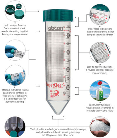Tube, Conical centrifuge; Labcon; SuperClear®; 50 mL; With attached flat screw caps; Caps include integral molded elastomeric seal; Patented anti-smear writing surface; 3 color printed graduations and reverse reading scale; ATP, RNase/DNase and Endotoxin Free (non-pyrogenic); Polypropylene USP Class VI resin; Centrifuging to 20,000 x G; Freezable to -80C; Autoclavable; Capacity: 50 mL; Teal color caps; 25 tubes per rack/20 racks per case; 29 mm W. 115 mm H.; Made in USA